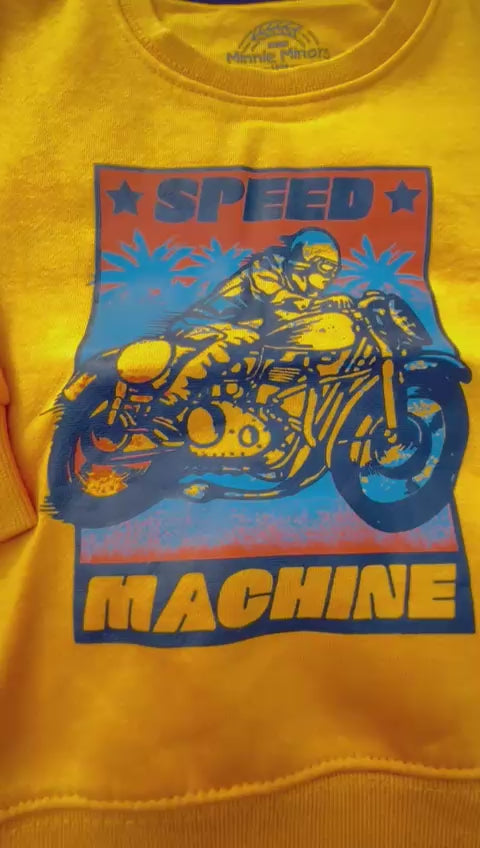 Design: Bold motorbike graphic with “Speed Machine” print for a trendy, energetic look